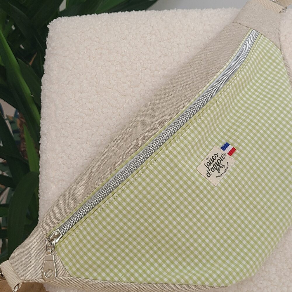 Adoptez un style unique et pratique avec ce sac banane cousu main en lin beige et coton vichy vert clair. Conçu pour allier confort et tendance, ce sac est l’accessoire parfait pour vos sorties quotidiennes. Son design moderne et raffiné  avec le tissu en velours et des matériaux de qualité, en fait un incontournable de votre garde-robe. Ce modèle fait main est entièrement personnalisable : choisissez parmi une gamme de coloris variés et ajustez la taille selon vos préférences pour un sac parfaitement adapté à votre style. Compact et fonctionnel, il offre suffisamment d’espace pour vos essentiels tout en ajoutant une touche de mode à vos tenues. Un sac unique, pratique et élégant, créé spécialement pour vous.